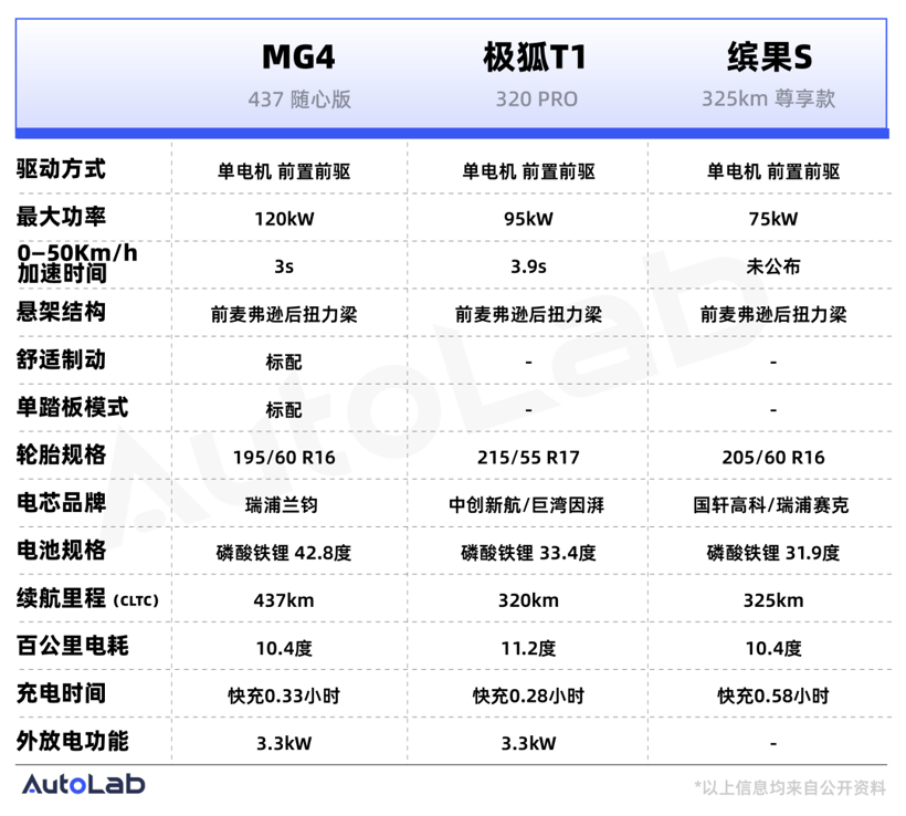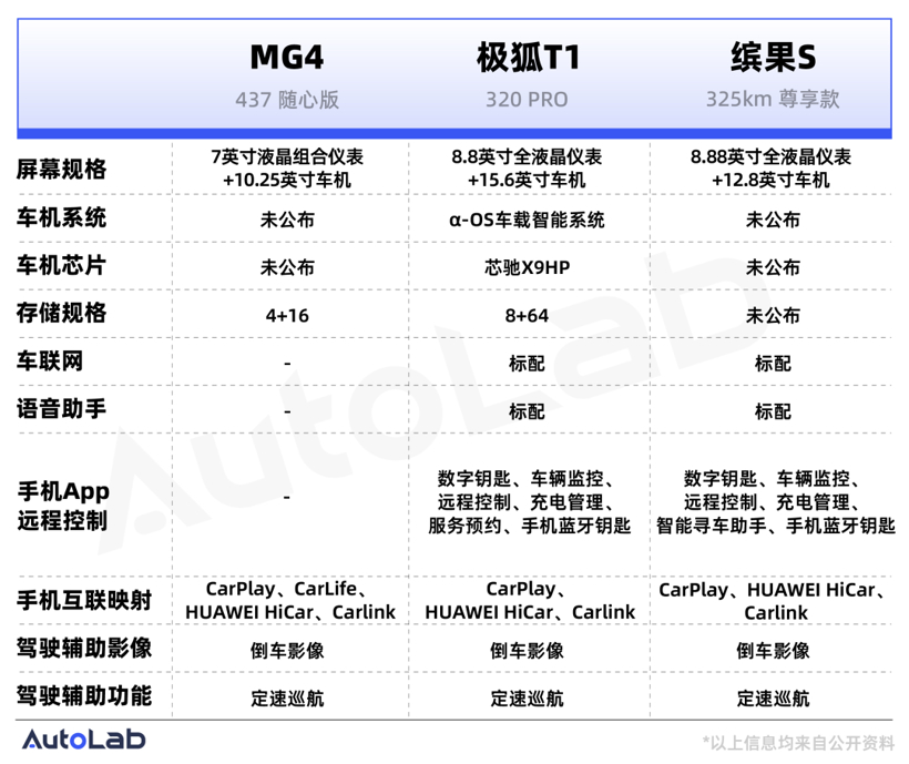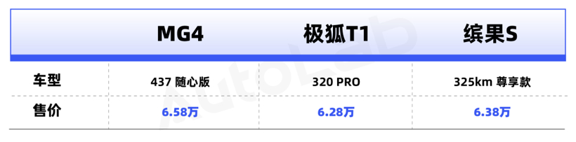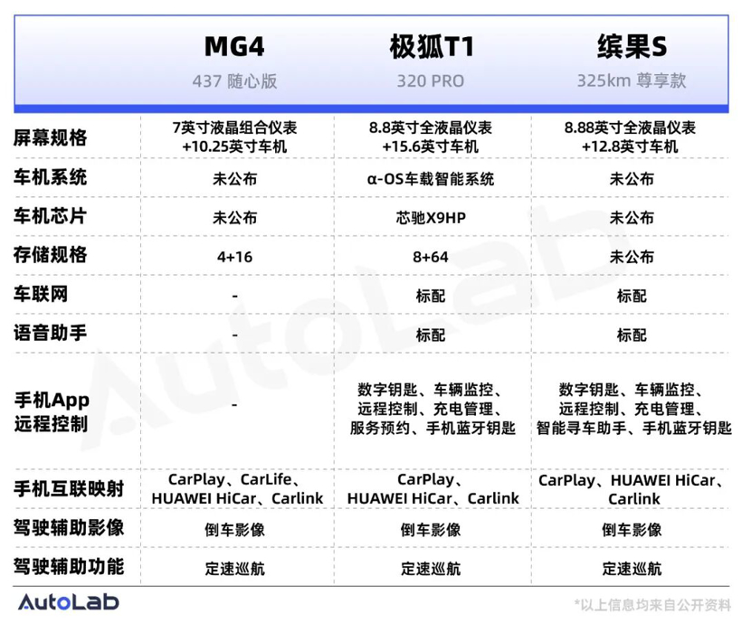 具体的车型上,我们选取了MG4、极狐T1以及缤果S这三款最近刚上市的新车。