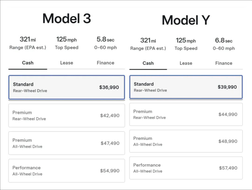 作为廉价版车型,Model Y Standard已于10月7日在美国发布,售价39,990美元(约28.47万元人民币),计划11-12月交付,Model 3 Stanard的起售价也降到36,990 美元,显然都只是第一步。