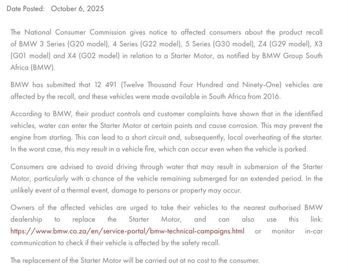 南非全国消费者委员会(National Consumer Commission)日前宣布,宝马集团南非公司(BMW Group South Africa)已发布公告,在南非召回12491辆汽车,起动机缺陷可能导致水进入起动机并引发腐蚀,进而造成短路。这种情况会导致起动机局部过热,甚至在车辆停放时引发火灾。此次召回涉及2016年以来在南非销售的六款车型,包括3系、4系、5系、Z4、X3和X4。安全风险跨越了宝马的多条产品线。