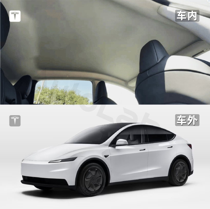 从车外看,标准版Model Y依然是玻璃天幕,但在车内,它用织物顶棚给整体遮挡住了。