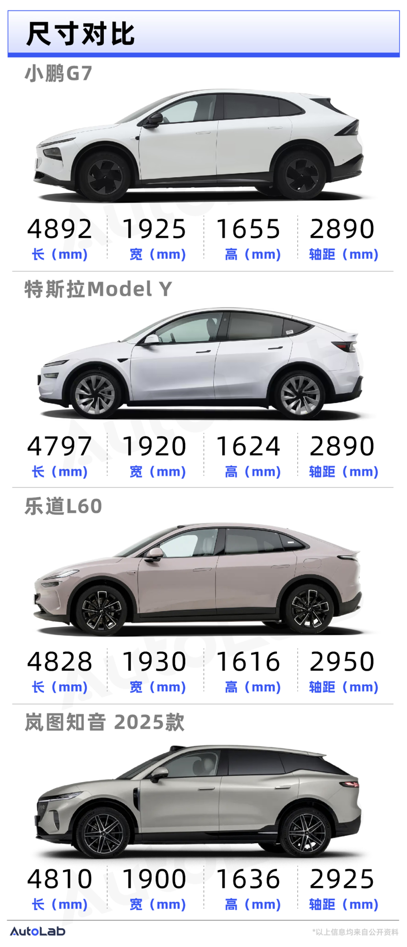 几台车的均定位中型SUV,因此在基础的尺寸上并没有太大的差别,G7更是和Model Y轴距也相同。