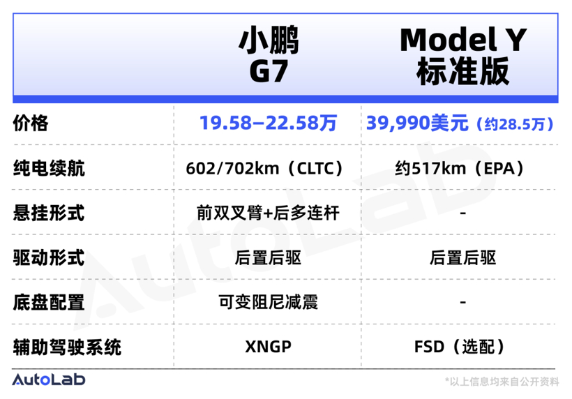 至于配置方面的区别,我们选择和更具代表性的小鹏G7来对比。除了以上罗列的信息外,两车在座舱舒适性、智能化体验方面,都有着比较大的差距。