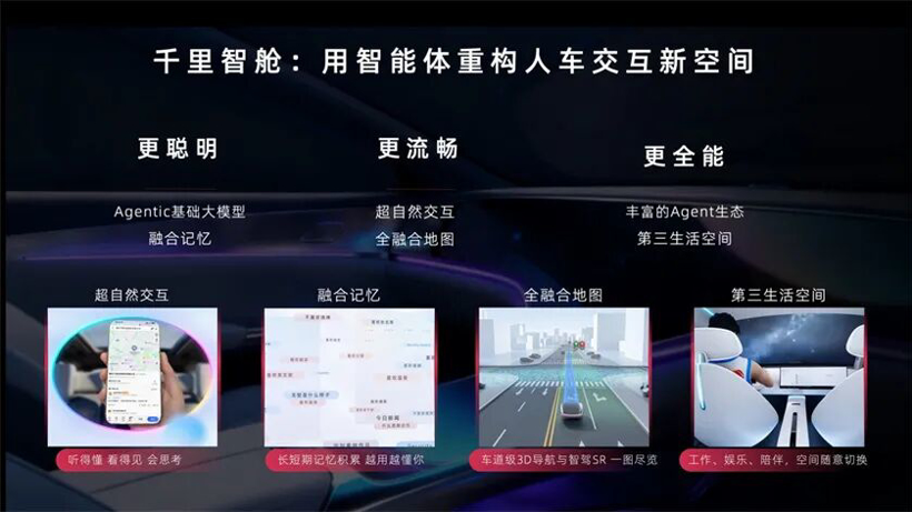 智能座舱被印奇视为「与智驾同等重要的场景」,千里科技推出智能座舱操作系统「Agent OS」,核心功能包括「超自然交互」、「融合记忆」、「全融合地图」与「第三生活空间」,印奇将其定义为「超级智能体雏形」。