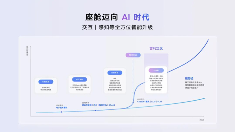 2025年1月,吉利正式发布「智能汽车全域AI」技术体系,不仅将AI广泛应用于架构、动力、底盘、座舱等智能汽车全域,还将AI深入到产品研发、生产、售后服务等全链路,吉利表示自己已成为全球唯一完成「全域AI」布局的车企。