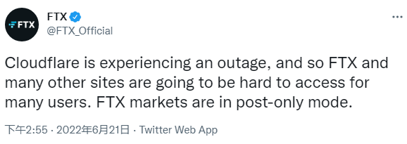@FTX_Official 官网推特账号也发文称,这家业内第二大加密货币交易所在服务宕机时变得无法访问,且曾短暂进入过“post-only”的交易模式。