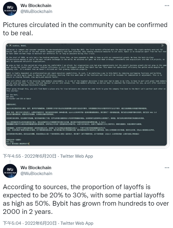 随着加密货币的暴跌遇冷,交易平台也不可避免地受到了影响。继 BlockFi 和 Crypto.com 之后,总部位于新加坡的 Bybit 也被迫裁员求生。James Wu 昨日爆料称,这家加密货币交易所正计划削减 20~30% 的员工。而在过去两年多的时间里,其规模刚从数百人增长到了 2000 。