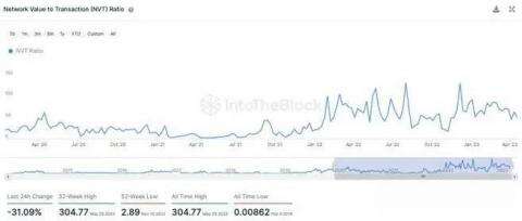 狗狗币的 NVT 比率在过去几个月一直处于下降趋势。就在过去一天,它已经下跌了 31% 以上。如下图所示,当前数字 [~39] 比其 52 周或 1 年高点低约 8 倍。