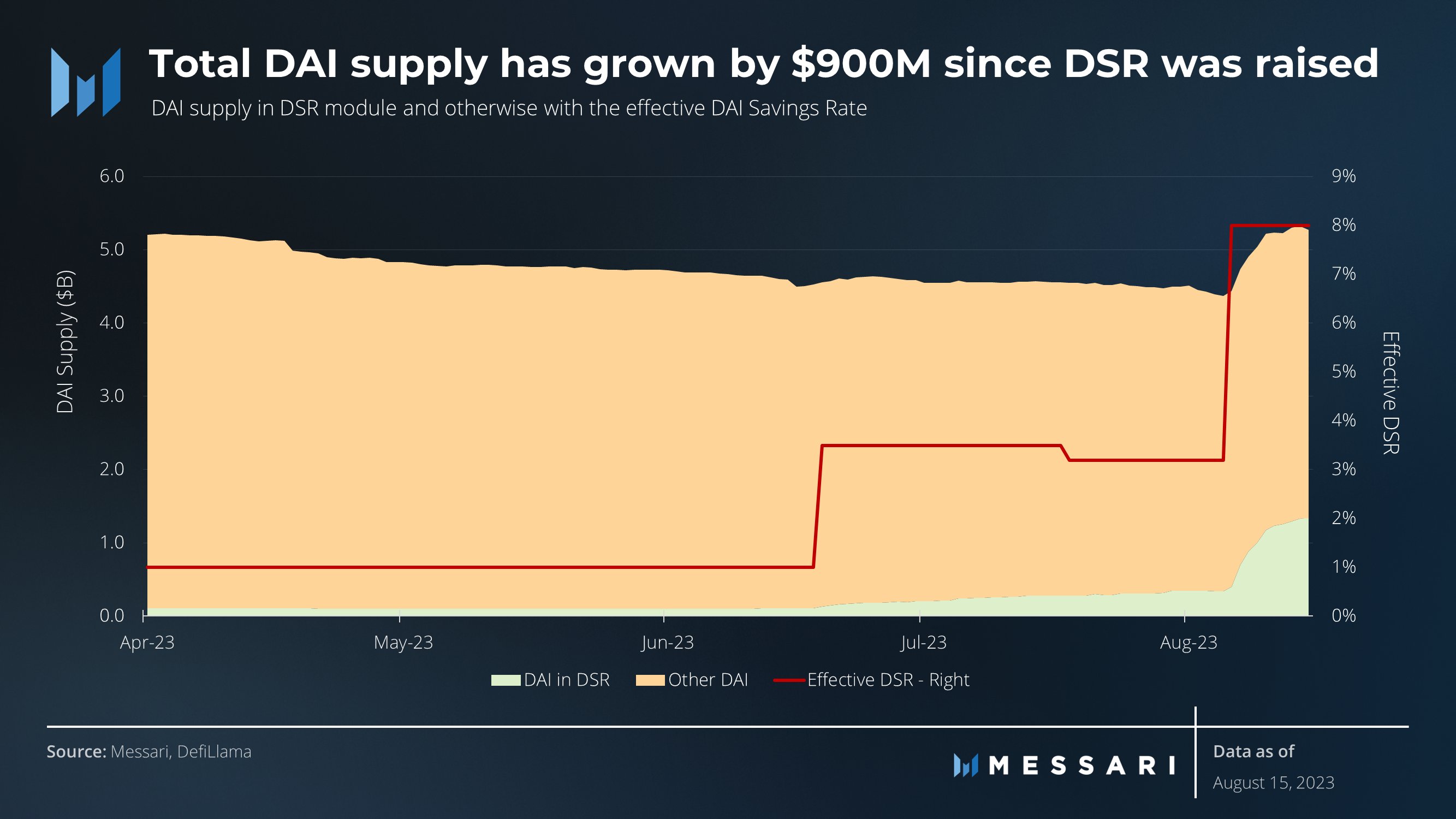 币圈子(120Btc.com)讯:为刺激市场对去中心化稳定币DAI的需求,去中心化稳定币协议MakerDAO在8月5日经社群投票,决定正式将Dai储蓄率(DAI saving rates,DSR)从3.19%提高至8%的提案,随后立即吸引众多投资者涌入,火必全球顾问、波场创办人孙宇晨等巨鲸也不断加码存入DAI,以获取高额利息。
