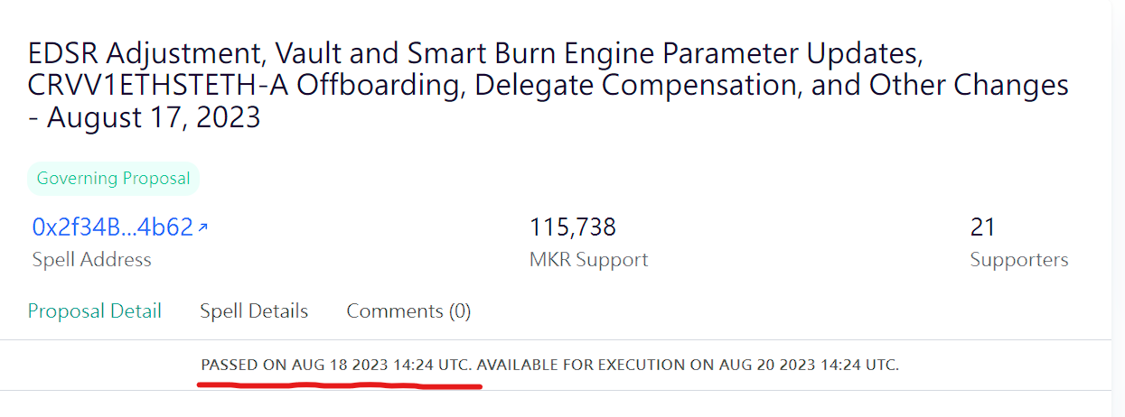 然而,知名加密货币市场情报平台Messari表示,在引入EDSR后,MakerDAO的利润预期将从8000万美元下降至不到200万美元。或是因为如此,根据MakerDAO治理页面最新公告,关于EDSR(增强型DAI储蓄率)和稳定费等一系列调整案已通过投票,其中就包括将DSR从8%下调至5%,而该投票结果将于北京时间8月20日晚上10点24分进行改动。