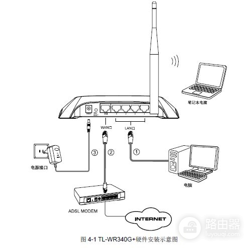 建立局域网连接,用网线将计算机直接连接到路由器LAN口,也可以将路由器的LAN口和局域网中的集线器或交换机通过网线相连,如下图4-1所示。