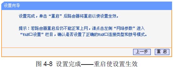 设置完成后,单击下一步,如果您更改了无线设置,将弹出下图4-8所示的设置向导完成界面,单击重启使无线设置生效。