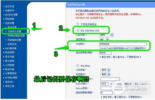 3.设置路由器2的WLAN端:设置密码,一般现在用WPA较安全些。记住无线路由器对外发信号的名称,和密码备用。