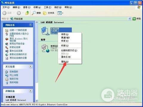 2、然后,在弹出的窗口中,我们就可以看到网上邻居了,很多时候,特别是在网络连接失败的情况下,本地连接图标有所不同,这里我们还需右击一下本地连接,然后,还是选择“属性”项目!