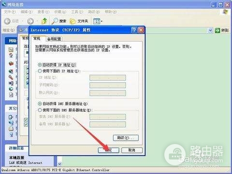 6、在弹出的对话框中,选择“自动获取IP”的选项,这样电脑就能用到路由器所分配的ip了,跟手机获取网络的方式基本相同!
