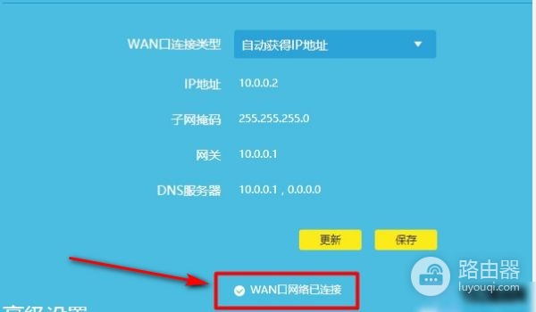 10、用电脑重新连接路由器,并登陆路由器网址设置页面,找到“上网设置”选项,看到“WAN口网络已连接”,表明无线路由器已设置成功。