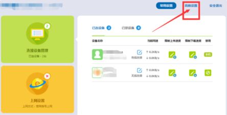 确定了以后,你会发现进入一个崭新的页面,如图,在设备名称下方的设备的当前网速这一栏里,网速基本为几KB/S或没网速,其实几K每秒和零K每秒是没有区别的,一旦电脑显示的网速是这个,那么说明,WIFI确实没有网速,然后如图,在右上侧有个“高级设置”这个功能,点开它。