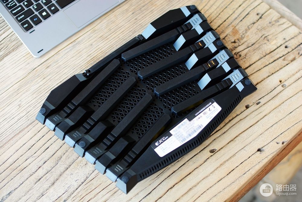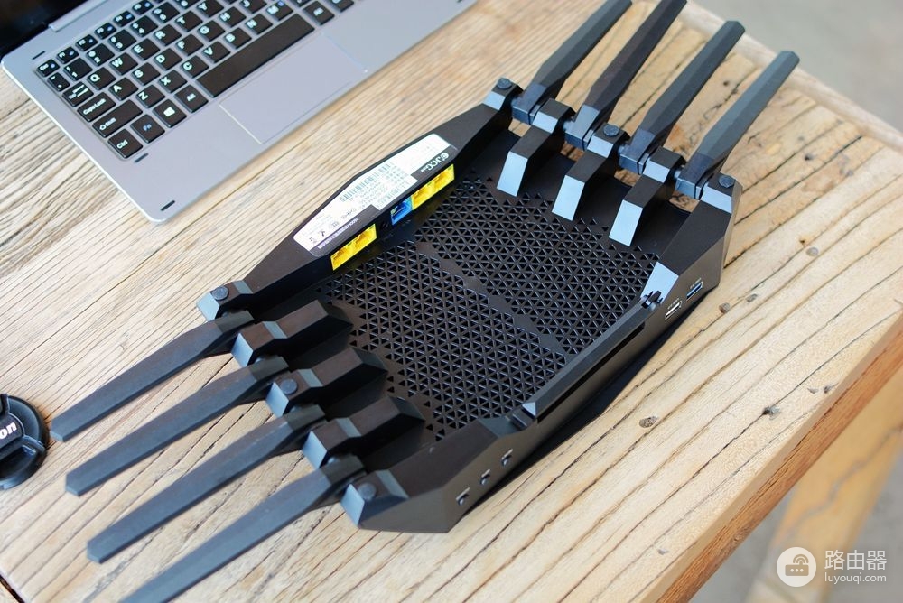 翻过来之后,还是很吸引人眼球的,使用了8根天线设计,而且可以折叠到路由器的底部。而底部,同样是大范围的散热孔。
