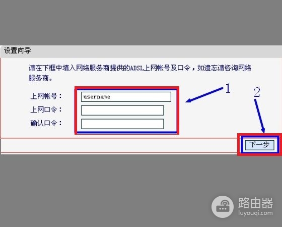 5.输入从网络服务商申请到的账号和密码,输入完成后直接下一步;