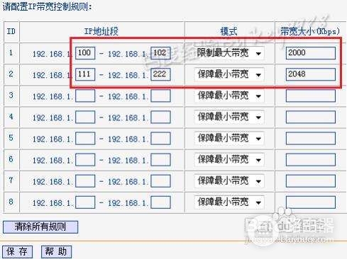 5、接下来在下在的IP地址段中详细设置各IP所用的带宽和控制方式: