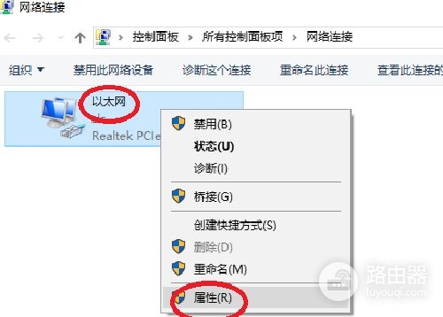 5、在出现的“以太网”上,右键点选”属性“。