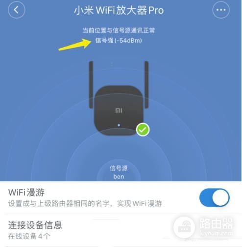 3、同时,在米家应用中,点击小米wifi放大器pro,可以看到它的信号连接状态。如图所示,当前无线连接的信号比较强,属于正常范围内。另外,在这里你还可以打开 WiFi 漫游,以及查看当前有多少设备接入了这个放大器中。