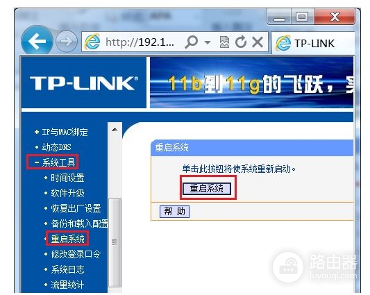 (4)重启路由器:设置完成后,要重启路由器才能生效,重启方法,在系统工具下面,选择“重启系统”这一项即可。