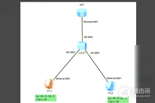 1、设备组网:2台电脑分别属于VLAN10和VLAN20,一台华为AR2220路由器和一台S5700交换机。