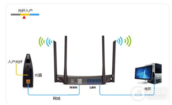 1.将宽带猫接出的或者入户网线插入到路由器wlan接口中,然后在通过网线或者无线网络连接电脑。