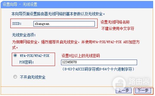 6、输入SSID名称,点选WPA-PSK/WPA2=PSK,设置PSK密码,点击下一步。