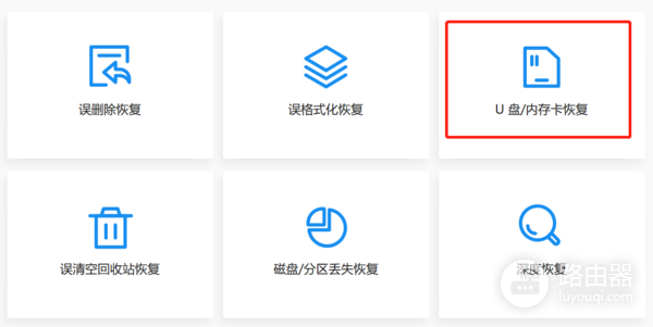 2、在主界面可以看到有六种扫描的模式,依次是误删除恢复、误格式化恢复、U盘/内存卡恢复、误清空回收站恢复、磁盘/分区丢失恢复、深度恢复,我们需要点击右上角的“U盘/内存卡恢复”。