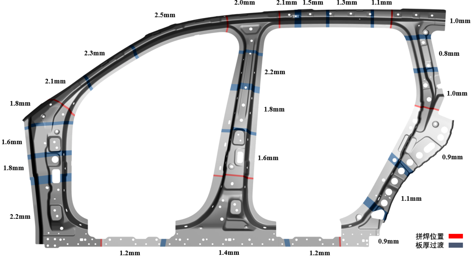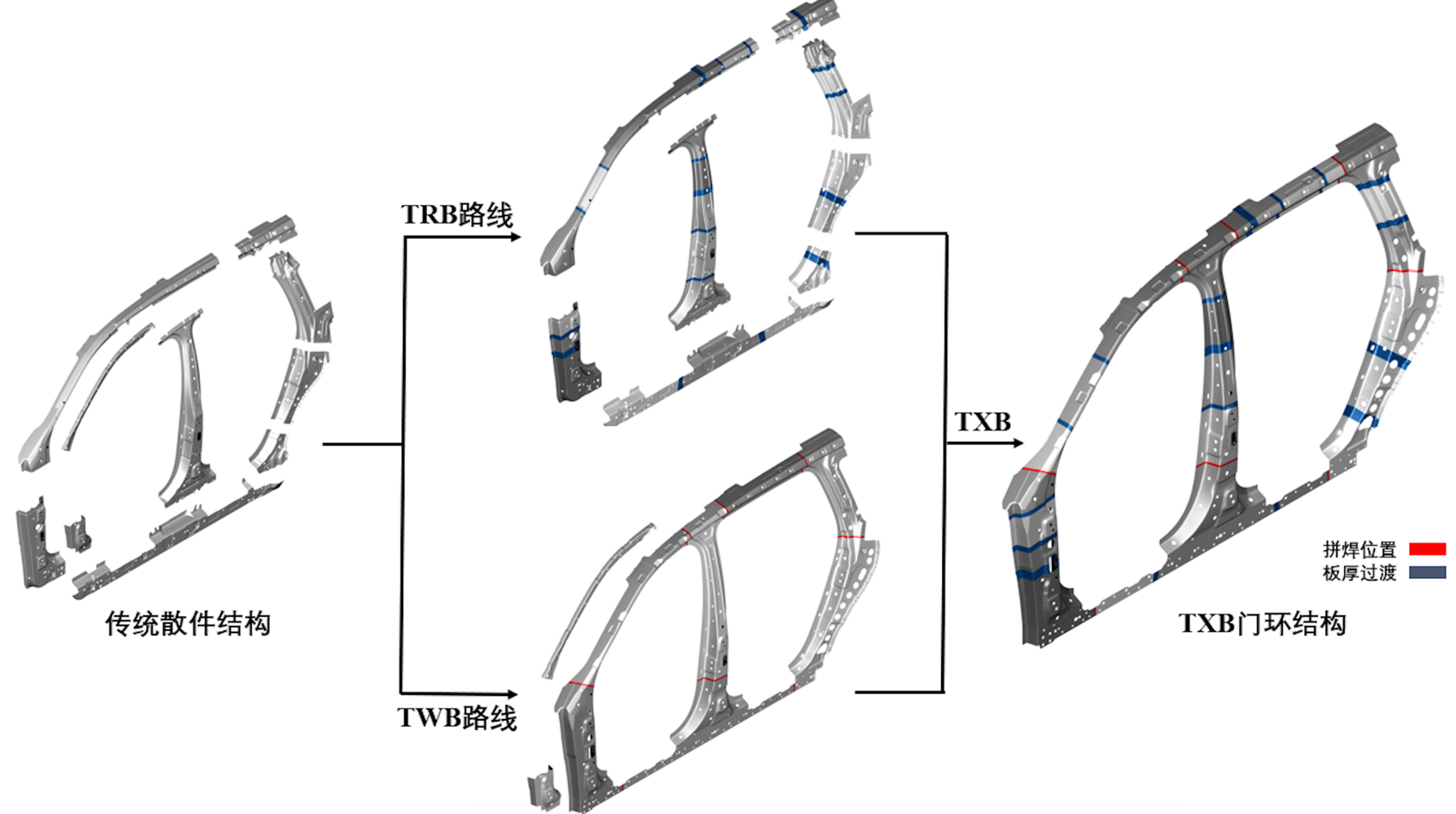 传统车身结构通常采用TRB或TWB两类技术路线。TRB技术能够较好的实现单个零件的轻量化,但在集成化方面由于仍采用点焊进行多个零件的连接,集成化效率较低;TWB技术则正好相反,其在板材阶段通过激光焊连接多个不同材料的等厚度钢板实现较好的零件集成化,但在零件局部加强上则需要通过打补丁的方式,无法实现极致的轻量化。