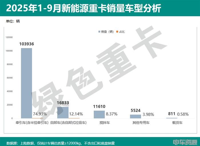1-9月,牵引车(含半挂牵引车)依然是主流车型,实销103936辆(占比74.93%),自卸车(含自卸式垃圾车)实销16833辆(占比12.14%),搅拌车实销11610辆(占比8.37%)。