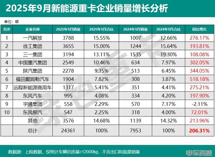 9月份新能源重卡销24361 同增206.31% 解放/徐工/三一居前三