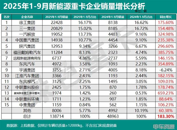 138714辆!1-9月新能源重卡狂飙 徐工/三一争冠 9月销24361辆 解放/徐工争冠