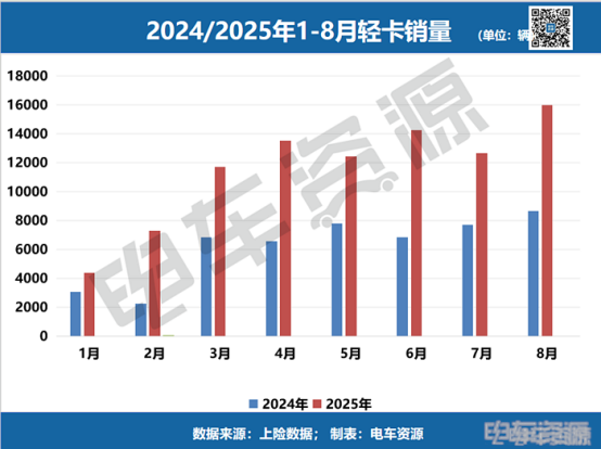 据电车资源行业研究院最新上险数据,2025年8月新能源轻卡市场销量达1.6万辆,同比增长84.4%;1-8月,新能源轻卡销量累计达9.2万辆,同比增长85.6%,销量持续走高,连续多月创下历史记录。