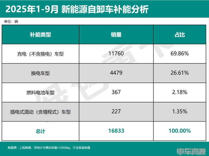 绿色重卡数据显示,2025年1-9月份新能源自卸车销售16833辆,其中,纯电动(不含换电)车型销售11760辆,占比69.86%,为新能源自卸车重要补能车型。其次,换电车型销售4479辆,占比达26.61%。纯电动自卸车与换电自卸车合计占据超过96.47%的新能源自卸车市场销量。