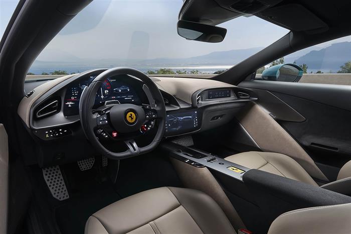 此外,新车的智能化水平也达到了新高度。人机交互界面围绕三块主要显示屏构建:15.6英寸数字仪表盘、10.25英寸中央触控屏以及一块8.8英寸乘客屏,后者可实时显示G值、转速等参数,让乘客共同沉浸于驾驶乐趣中。系统标配Apple CarPlay,并支持手机无线充电。同时,新车搭载了新一代高级驾驶辅助系统,包括自适应巡航、车道保持、盲点监测等功能,全面保障行车安全。车主还可通过MyFerrari Connect系统远程监控车辆状态。