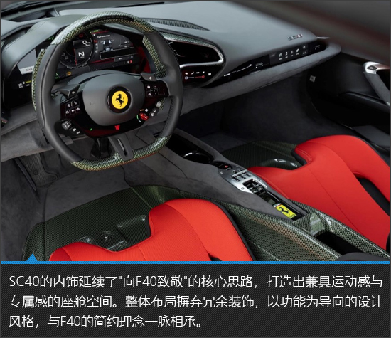 SC40是一款真正意义上独一无二的定制力作,由法拉利特别项目Special Projects部门为特定客户量身打造。新车名称“SC40”以立体浮雕形式镌刻于车身侧面,不仅象征其独特身份,也向品牌历史上最具代表性的超级跑车F40致敬。然而,SC40并非对经典的简单复刻,而是一次对法拉利设计哲学的现代化诠释。