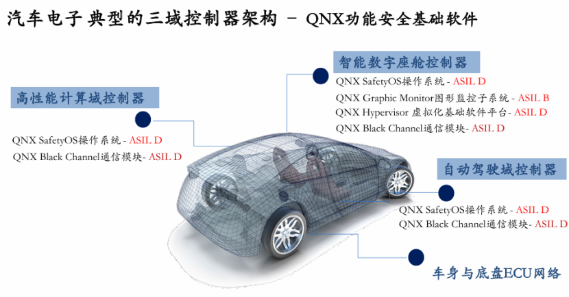 2025年是跨域融合项目集中落地的一年,例如别克至境L7车型采用高通8775芯片和QNX 通过TUV莱茵ISO26262 ASIL D最高等级功能安全的QNX RTOS和QNX Hypervisor等基础软件开发平台实现舱驾一体的功能,东风日产、北汽等车企也开始量产融合座舱与高级辅助驾驶的平台的车型。在车身控制方面,QNX基于SDP平台应用于宝马、岚图等车型,但趋势显示中央网关控制器逐渐由高性能计算域兼容。