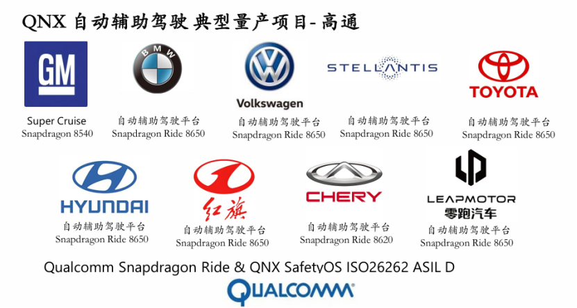 在高级辅助驾驶领域,在英伟达平台上,QNX早期与Xavier平台合作,在2020年助力小鹏汽车量产,为X-Pilot 3.0系统提供QNX SafetyOS支持,后续为更多的OEM提供基于Orin平台的通过TUV莱茵ISO26262 ASIL D功能安全认证的基础软件开发平台。另一方面,在高通Snapdragon Ride平台亦采用QNX基础软件,目前在国内,已经有十多个基于基于高通8650芯片和QNX SafetyOS的OEM项目量产,同时QNX也非常重视和中国头部智驾芯片解决方案公司的合作,例如QNX最新的通过TUV莱茵ISO26262 ASIL D功能安全等级的QNX OS for Safety 8已经完全的支持地平线J6系列芯片,并且双方密切合作,已经定点了国内外多个头部OEM的辅助驾驶量产项目。