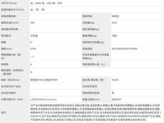 动力方面,新车将搭载型号为TZ200XYC的后置永磁同步电机,最大功率230kW,搭载74.88kWh的磷酸铁锂电池,最大续航为650km,最高车速可达180km/h。关于新车更多信息,车质网将持续关注及报道。