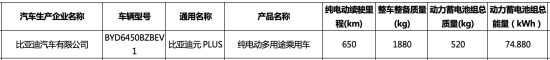 近日,我们从工信部获得了新款比亚迪元PLUS的申报信息。新车将匹配容量为74.88kWh的电池组,续航里程为650km(测试工况未公布)。