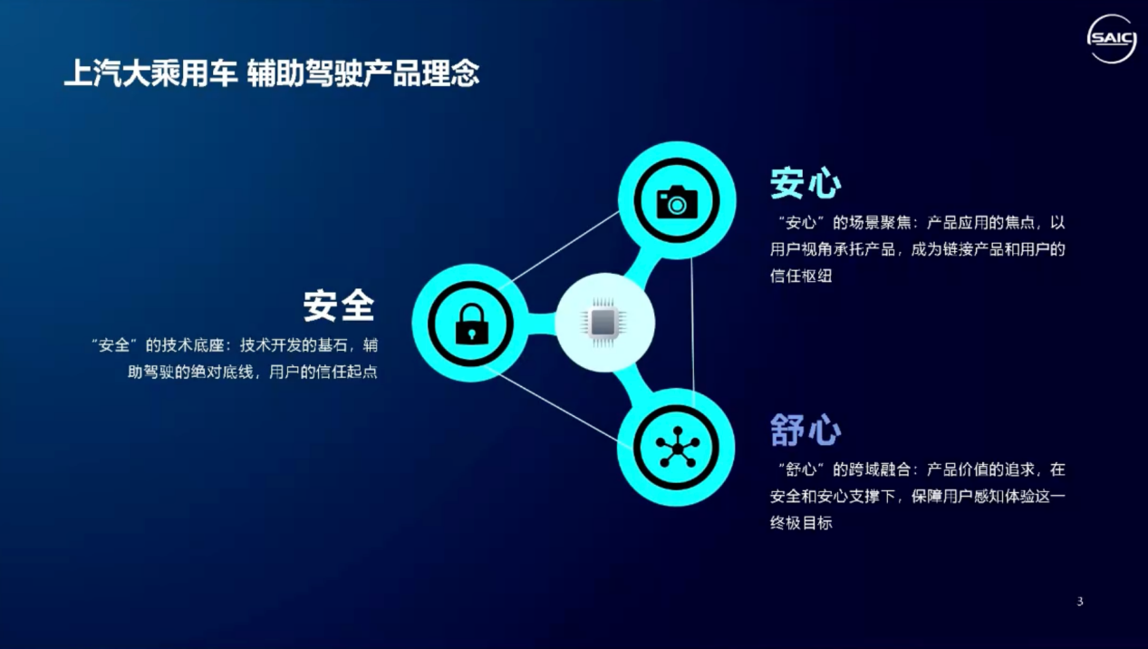 用户关切何在?这始终是上汽集团创新研发总院在技术研发过程中深入思考的核心问题。在技术开发与产品应用过程中,理念问题至关重要。在开展驾驶辅助研发时,上汽集团提炼出了安全、安心、舒心三大理念,构建了一个稳固的三角结构。