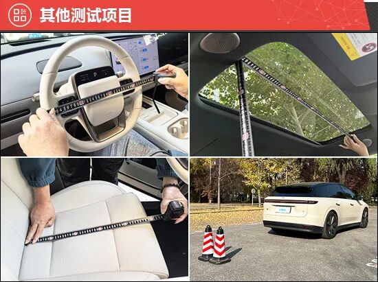 此外,我们还针对驻车雷达、灯光/视野、操控系统、轮胎、天窗、座椅、后备厢进行了测试。经过测试,2025款理想i6的前后排座椅座垫长度均达到同级别上游水平,乘坐体验舒适。评测车选配米其林e·PRIMACY系列轮胎,具有低噪音和低滚阻等特点,规格为265/45 R21。相对而言,两侧外后视镜视野范围角度未达到同级别车型测试均值,有待优化。