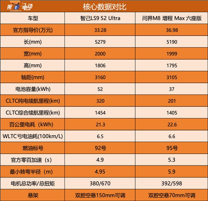 问界M8增程版全系有六款版本,电池容量提供37kWh和53.4kWh可选,但53.4kWh版本的指导价已超过了35万元,所以我们以两款车的入门版本为例,智己LS9 52Ultra的电池容量为52kWh,问界M8增程Max 六座版为37kWh,对应的CLTC纯电续航分别为320km和201km,但前者明显有119km的纯电里程优势,一方面能持续提供电车的静谧性和加速体验,另一方面也将间接降低燃油消耗成本。