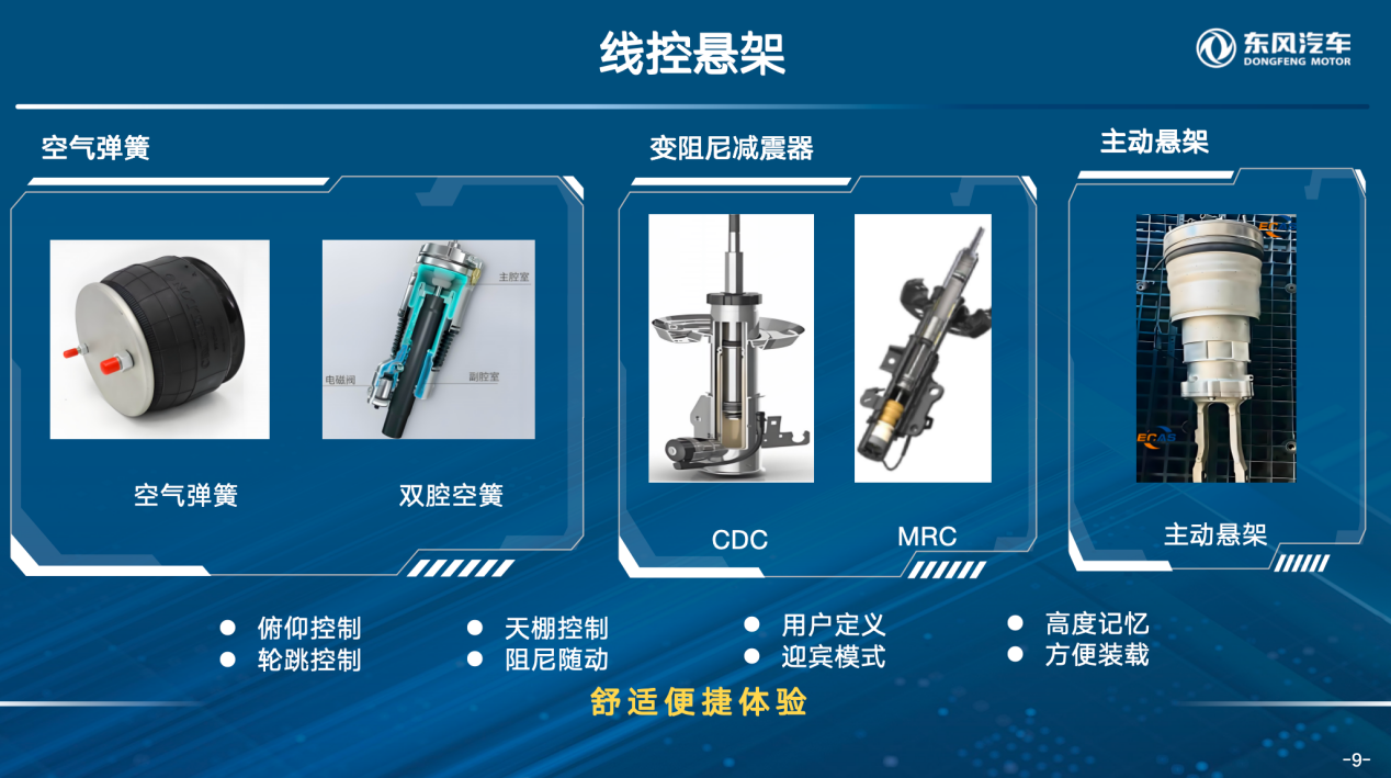另外是垂直方向的线控技术,其核心构成主要包含两部分。其中一部分是空气弹簧的应用,当前众多中高端车型已广泛配备空气弹簧,且其形式多样,涵盖传统的单腔、双腔,甚至三腔空气弹簧。这类空气弹簧不仅能够调节车辆车架的高度,还具备变刚度等特性。