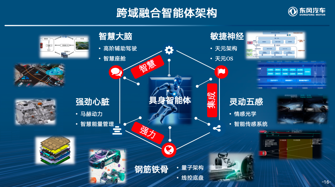 下图是东风汽车跨域融合智能体架构图,该架构涵盖多个关键技术领域。首先,架构中设有“智慧大脑”模块,包含高阶智能辅助驾驶系统与智慧座舱系统。同时,架构搭载车辆动力核心——东风自主研发的马赫动力系统,并配备智慧的能量管理系统。其次,线控底盘作为架构的“钢筋铁骨”,具备灵动无感的特性。架构还集成了各类智能传感器系统及其融合算法,同时通过车内情感光学技术为驾驶员提供增益体验。最后,架构的“敏捷神经”由天元架构与天元操作系统构成,二者作为连接各模块的神经触丝,实现系统间的高效协同。