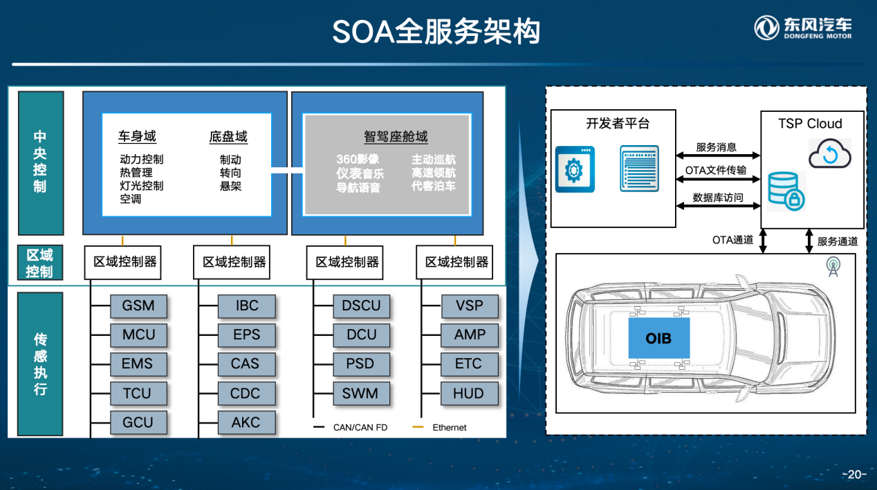 下图是SOA全服务架构。在中央控制层面,主要分为两大部分,一是智能辅助驾驶座舱域,二是车身域与底盘域。这两大域之下挂载了众多区域控制功能,涵盖网关以及各类底盘区域控制等。在这个架构上,可挂载多种服务功能,例如将制动、转向、悬架等分别构建为独立的服务,并依据优先级开展服务调度。此为单车架构。在车云协同方面,借助开发者平台,开发者能够开发所需的APP,并在TSP云上完成软件的安全验证与认证等流程。若通过认证,便可通过OTA通道对车辆进行云端软件更新,此方式有效提升了开发效率。