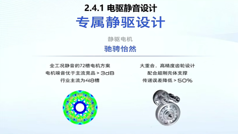 在静音设计上,团队采用72槽电机方案,相比主流48槽竞品噪音优化3dB以上;通过齿轮宏观和微观参数优化软件,从百万方案中优选齿轮设计,实现大重合度和高精度齿轮配合超刚壳体,传递误差降至0.25微米。并应用声学包隔绝中高频噪音约5dB,悬置采用高阻尼复合材料,整体阶次噪音在常用工况下低于70分贝。