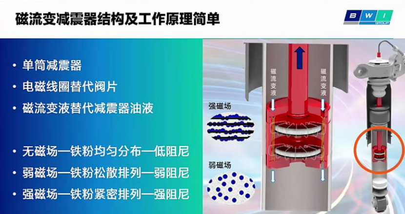 2025年11月20日,京西智行集团工程副总裁及悬架CTO陈伟刚博士在第五届汽车AI智能底盘大会上表示,在电控减震器领域,除常见的电磁阀外,磁流变技术是另一条重要技术路线。其核心原理在于通过电流精确控制磁流变液内部磁性颗粒的排列状态,实现阻尼力的毫秒级、无级调节。与电磁阀相比,磁流变减震器采用单筒结构且无复杂机械阀系,凭借更简单的结构带来了更高的可靠性、更优的成本控制潜力与更便捷的软件化标定流程。